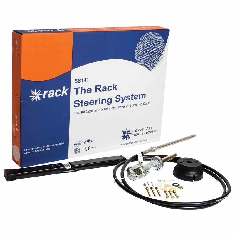 This rack-style steering system uses a machine cut pinion gear, which engages a pre-assembled rack and cable with armor-stranded core. Replaces most rack systems. Includes rack helm, 90° bezel, bezel kit, steering cable with stainless steel output end. Steering wheel and link-arm kits sold separately.