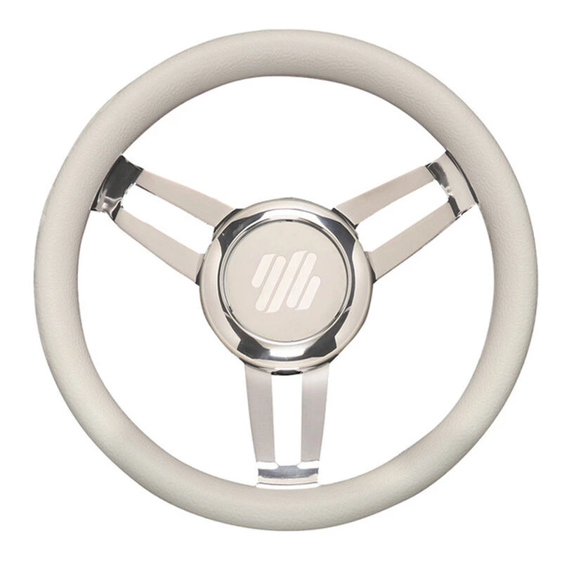 *Give your boat sleek and stylish Italian sports car looks with this special steering wheel. All UFLEX Steering Wheels meet the EEC directive 94/25 requirements about pleasure boats. CE marked in conformity with the EN 28848-EN 29775 and ABYC P22 safety standards. Hub included. Features white grip and chrome spokes.